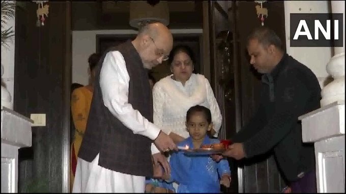 Delhi: Union Home Minister Amit Shah celebrates 'Ram Jyoti' at his residence, to mark the Ayodhya Ram Temple 'Pran Pratishtha' ceremony.