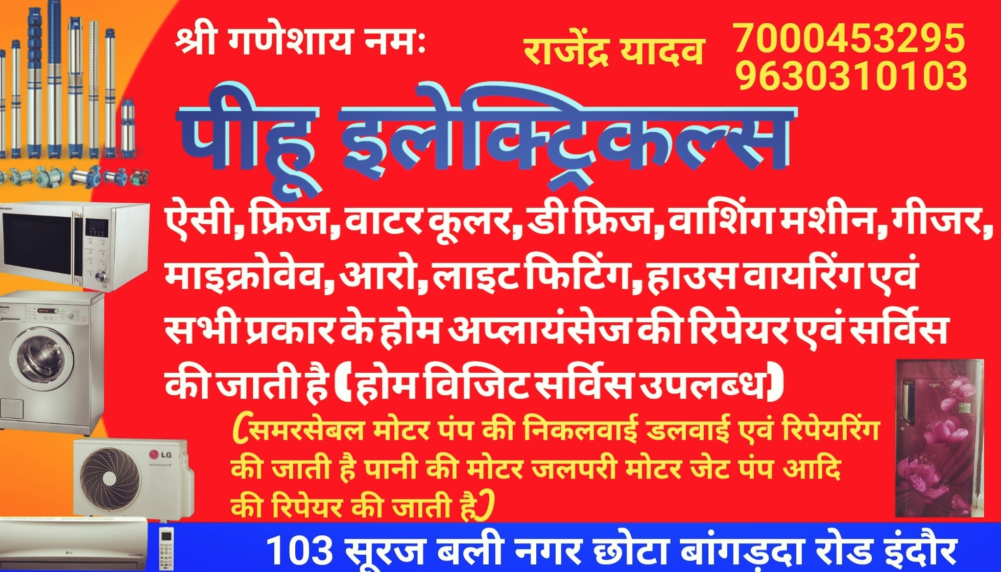 I'm an Electrician AC, Dee Fridge, Fridge, visi cooler, Water dispenser, Washing Machine, RO, Geyser, Induction, Microwave, Fan, water Pump motor, jet pump, Air cooler, Light fitting work, and All Home Appliances repair.