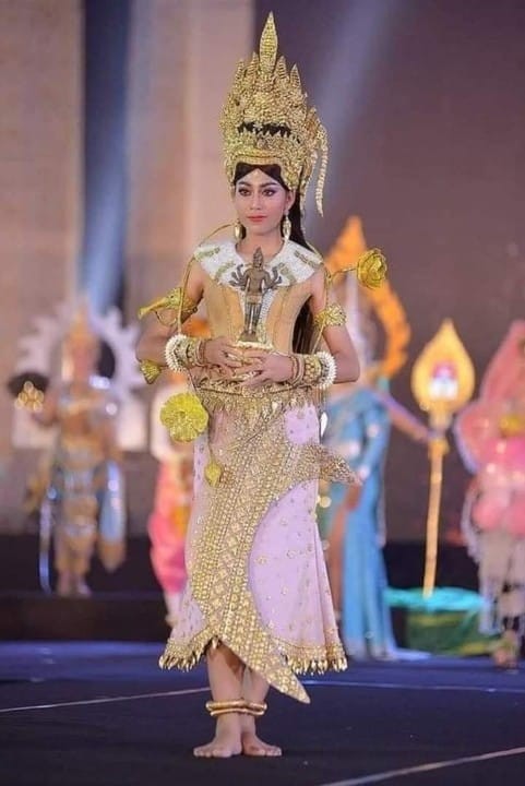 ये #मिस_कम्बोडिया हैं, 👇👇👇 #अप्सरा_अंकोर की ड्रेस में हैं, ट्रोफ़ी में उन्हें भगवान विष्णु की प्रतिमा मिली हुई है...