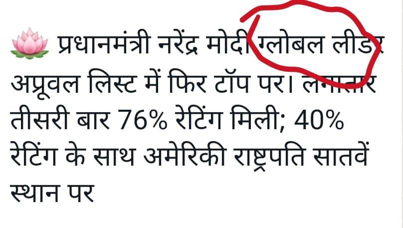 वर्ल्ड के टॉप तें लीडर मे बाइडेंन तीसरे स्थान से सातवे स्थान पहुँचे, जब की मोदी 44% से बढ़ कर 47% से टॉप पर बने हुए है, भारत के इतिहास मे प्रथम बार कोई नेता टॉप टेन मे पहुँच कर पहले पायदान पर विश्व गुरु बनने की और अग्रसर है ,,,, हर एक भारतीय को आज गर्व होना चाहिए। हमे ऐसा नेता 70 साल बाद मिला जिसने भारत को मान दिलाया।🙏