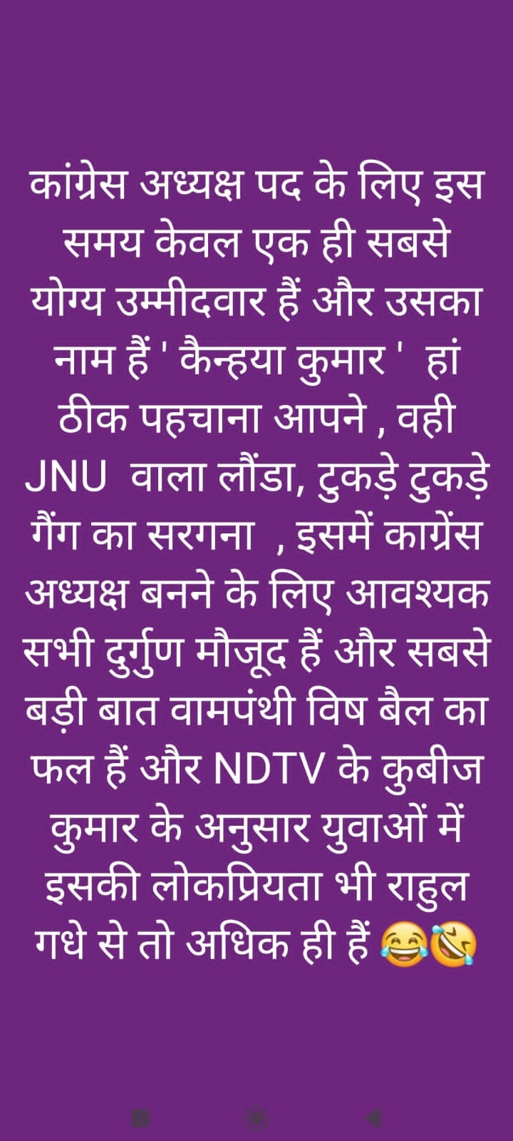 #कांग्रेस #अध्यक्ष पद के लिए इस समय केवल एक ही सबसे योग्य #उम्मीदवार हैं और उसका नाम हैं #कैन्हया_कुमार हां ठीक पहचाना आपने, वही #JNU वाला लौंडा, #टुकड़े_टुकड़े_गैंग का सरगना, इसमें काग्रेंस अध्यक्ष बनने के लिए आवश्यक सभी #दुर्गुण मौजूद हैं और सबसे बड़ी बात #वामपंथी विष बैल का फल हैं।