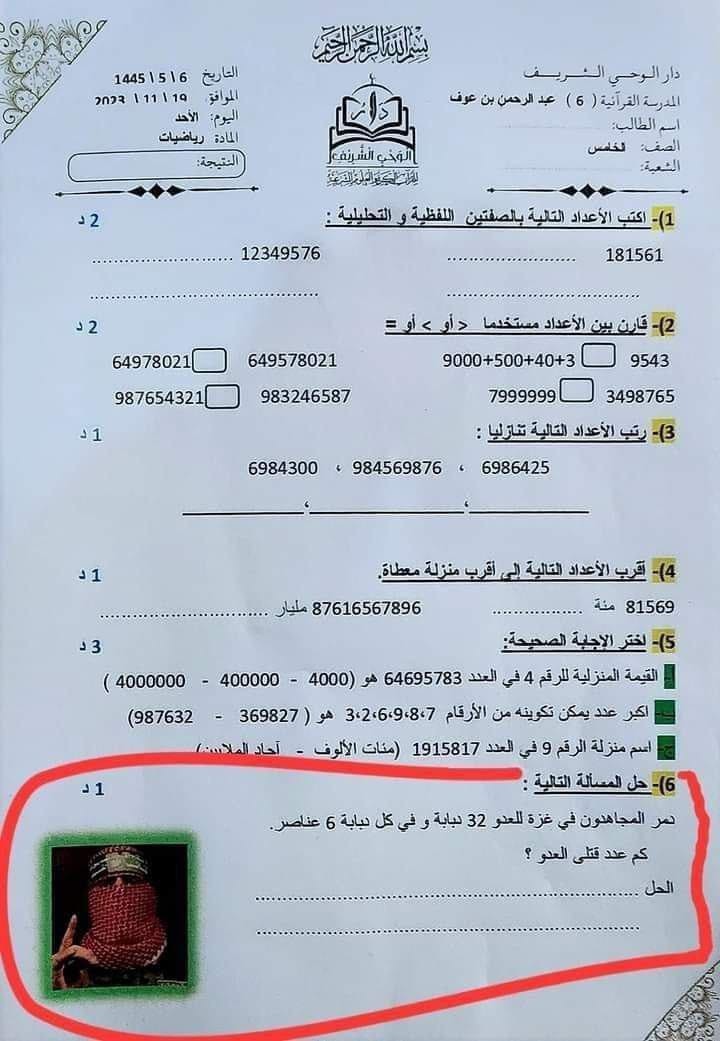 #Breaking_News Mathematics paper question in a school in Syria Gaza Mujahideen destroyed 32 tanks, each tank had 6 soldiers - how many soldiers were killed yesterday? The paper also printed a photo of Abu Obaidah Hamas spokesman. Such questions about the Gaza war have been included in children's papers in schools in many countries.