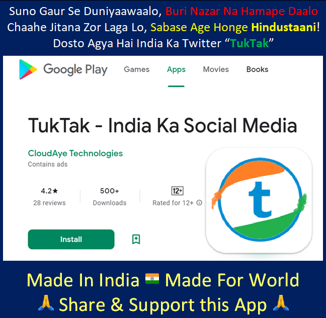 भाईओ बहनों और मित्रों #Twitter के टक्कर में #Koo के बाद एक और #MadeInIndia एप #TukTak 👇 आया है कृपया इसे युज करें और रेटिंग जरूर दे..!🙏🙏🙏 @R
