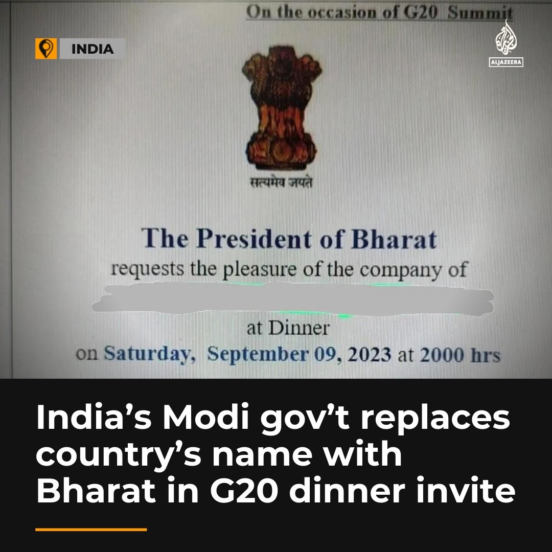 PM Modi’s gov't replaces the name India with Bharat in G20 dinner invitations, triggering speculation that the name of the country will be officially changed aje.io/bq0utp
