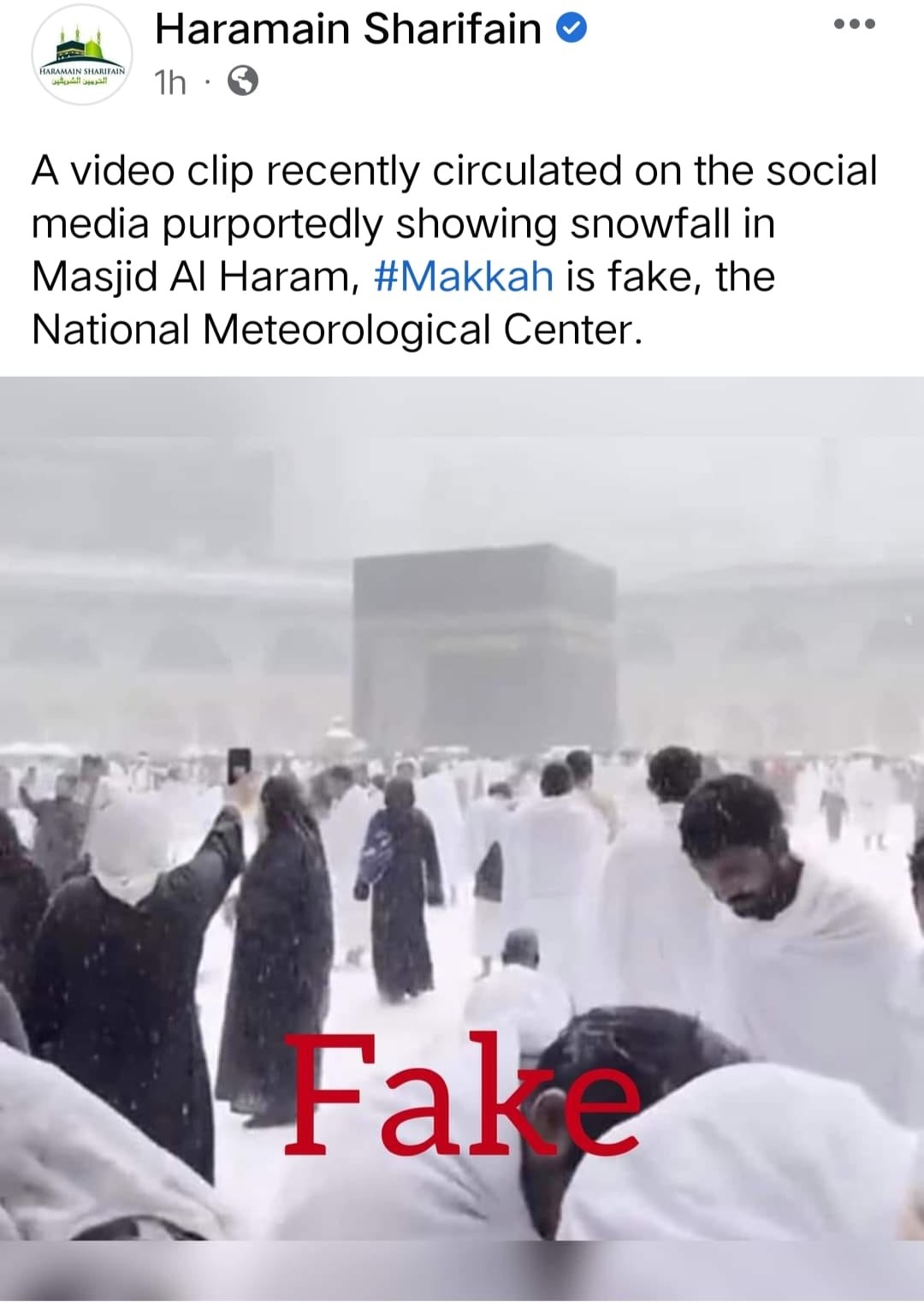 سوشل میڈیا پر وائرل ہونے والی مکہ المکرمہ میں برفباری کی ویڈیو جعلی (فیک❌) ہے۔ ویڈیو کو شئیر کرنے سے پہلے تحقیق کرلیا کریں کہ ویڈیو سچ یا جھوٹ پر مبنی ہے۔ جھوٹ کو پھیلانے سے گریز