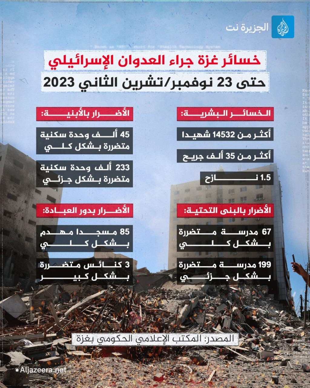 In the 48 days of the Gaza war, more than 14532 martyrs, more than 35 thousand injured, more than 7 thousand missing, buried under the debris, more than 1.5 million homeless, 45 thousand domestic buildings, flats destroyed, 233 thousand houses affected by bombing, 67 schools completely destroyed, 199 schools bombed. 85 mosques affected by total martyrdom More than 170 mosques affected by bombing 3 churches destroyed by bombing Dozens of hospitals affected by bombing